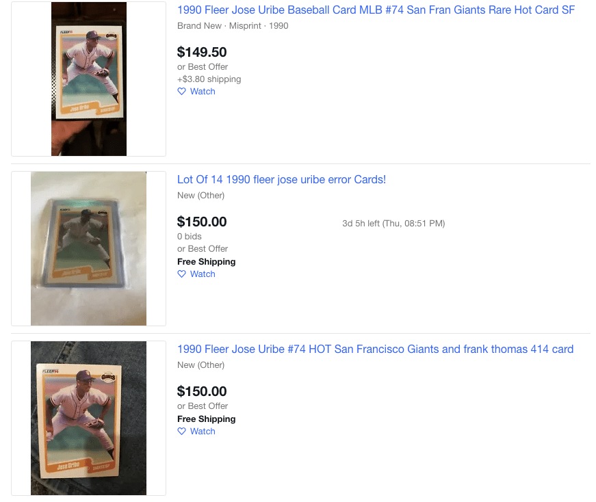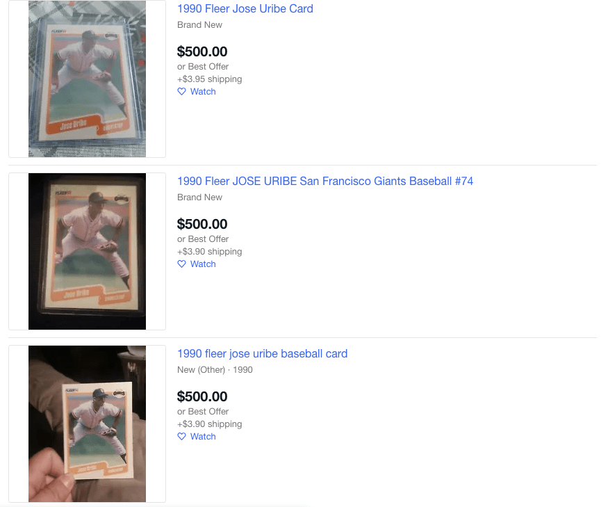 Overall, we may not know the real reason behind these overpriced Jose Uribe baseball cards. What is known is the repercussion of these eBay listings. Due to these massively overpriced listings, dozens more have found their way to eBay in the hundreds of dollars. Although this may be significantly less than the higher amounts, they’re still listed at a considerably higher price than the few cents they should logically cost.