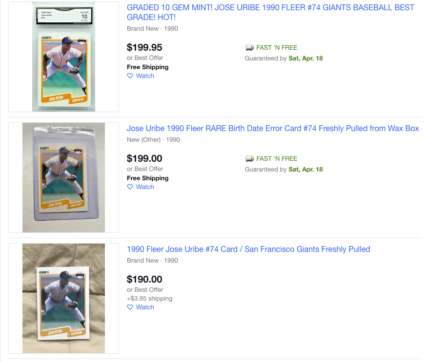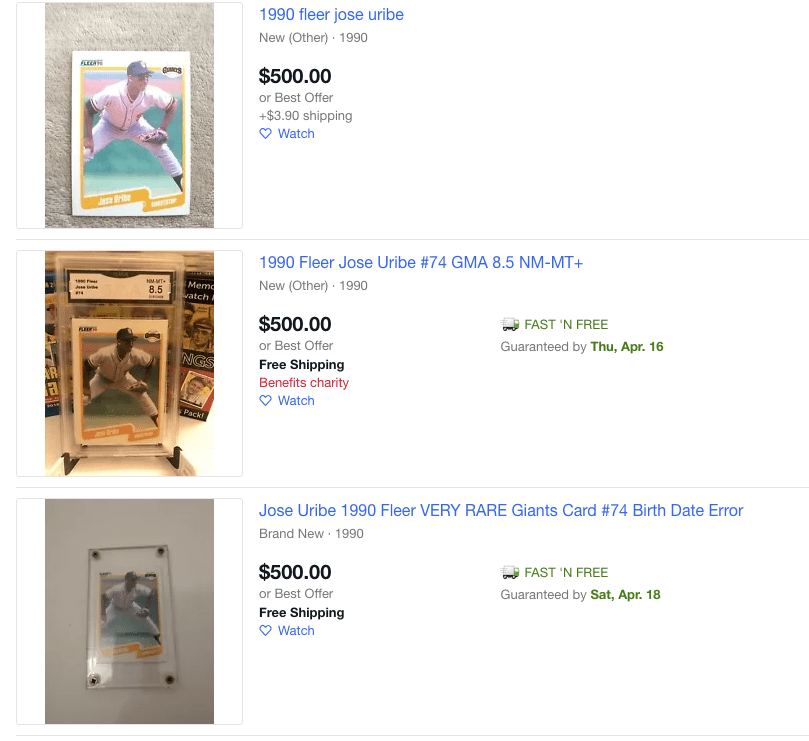 It was a humorous posting to see, but the other cards didn’t drop off in pricing. Following this posting, the next-highest priced Jose Uribe cards were 525,000 dollars, 29,999 dollars, 24,000 dollars, and 20,000 dollars, respectively. Even from there, numerous amounts of these cards were being listed in the thousands of dollars.