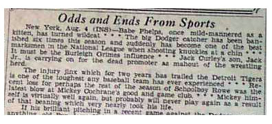 Next is to look at the names mentioned in the newspaper. The first name is Babe Phelps. Phelps played in the MLB from 1931 to 1942. In 1938, he was with the Brooklyn Dodgers, which aligns with the article. Another player mentioned is hall of fame player Mickey Cochrane. Although Cochrane only played from 1925 to 1937, he did manage the Detroit Tigers from 1934 to 1938. The article mentions Cochrane to be in possession of the Tigers, as if he was managing. This shows the facts of the article to be straight, meaning there are no glaring inconsistencies that prove it to be forged.
