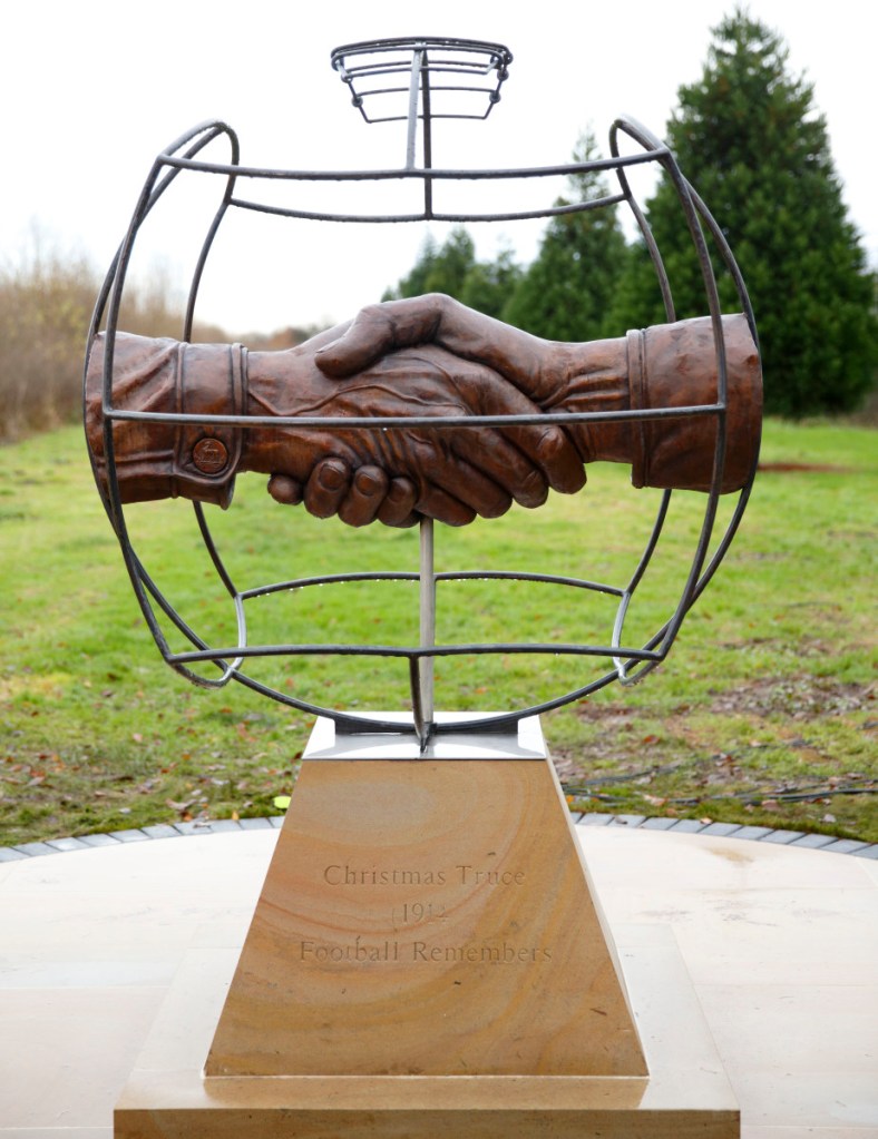 This truce is memorialized across the world, with the soccer match being the main focus of such memorials. In Liverpool, England, there is a statue at St. Luke’s Church depicting a German and a British soldier shaking hands over a soccer ball. In the Ploegsteert Wood Military Cemetery in Belgium, the truce is memorialized with a soccer ball on a marble plinth. At the National Memorial Arboretum, there is a sculpture of British and German hands clasping within the outline of a soccer ball.