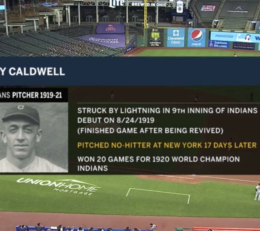 During the broadcast of the MLB game between the Cleveland Indians and Minnesota Twins on August 24, 2020, Fox Sports Cleveland, the flagship television station for the Indians, ran the following infographic on former Cleveland pitcher Ray Caldwell: According to the unbelievable stat line, on that date 101 years prior, Caldwell was struck by lightning in the final inning of his Indians debut. Despite being … Continue reading Ray Caldwell: The Pitcher that Was Struck by Lightning